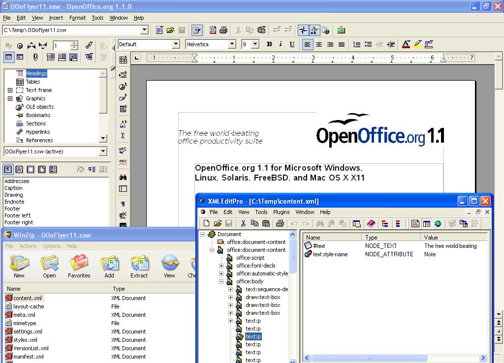 Grafik11 Das standardmäßige Dateiformat in OpenOffice.org ist ein offenes XML Dateiformat, welches in einem 500 Seiten umfassenden Dokument spezifiziert wurde. Jedes OpenOffice.org Dokument besteht aus einem Zip-Archiv, welches einzelne XML Dateien für den Inhalt, die Styles und die Metadaten enthält. OASIS benutzt das Dateiformat von OpenOffice.org als Basis für die Entwicklung eines industrieweiten Standards eines offenen Dokumentenformates für Büroanwendungen. Für gewöhnliche Endanwender bedeutet dies, dass auf den Inhalt von Dokumenten auch zugegriffen werden kann, ohne OpenOffice.org zu benutzen.