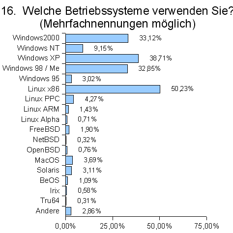 Ein, mit über 50%, hoher Anteil der Anwender benutzt Linux. Gleichzeitig benutzen aber fast alle Anwender eine oder mehrere Versionen von Windows. Die Anwender benutzen offenbar verschiedene Betriebssysteme nebeneinander, kennen sich sowohl mit Linux als auch mit Windows aus.