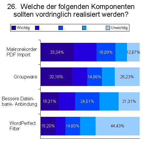 Der Großteil der Anwender befürwortet die vordringliche Realisierung des Makrorekorders und des PDF-Imports (leider wurden beide Features in einer Antwortmöglichkeit zusammengefasst). Danach folgen Groupware, Datenbankanbindung und Filter für Wordperfect. Diese Verteilung ist insofern interessant, da auf die vorhergehende Frage, welche Komponenten gewünscht werden, eher mit Groupware oder Datenbanken geantwortet wurde.