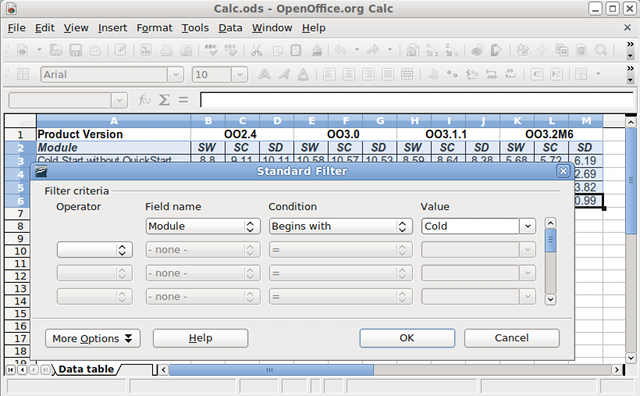 Calc filtersThe "Standard Filter" dialog now shows 4 instead of 3 conditions, and has a scroll bar which allows to access up to 8 conditions in total. It now supports the filter conditions 'Contains', 'Does not contain', 'Begins with', 'Does not begin with', 'Ends with' and 'Does not end with'.